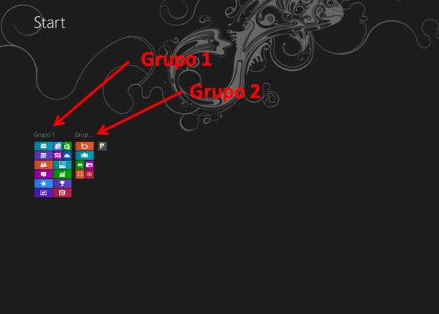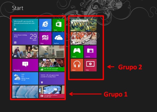 En Windows 8 creamos grupos de aplicaciones pegando sus Live Tiles en la pantalla de inicio. A estos grupos le podemos asignar nombres. Pero a diferencia de lo que sucede en otros sistemas los Tiles no cambian de tamaño cuando entran en un grupo. Los Live Tiles agrupado en Windows 8 permanecen del mismo tamaño. Lo que separa a un grupo del otro es solo un espacio más amplio del espacio que separa a los Tiles entre si mismos. Abajo una imagen explicativa.