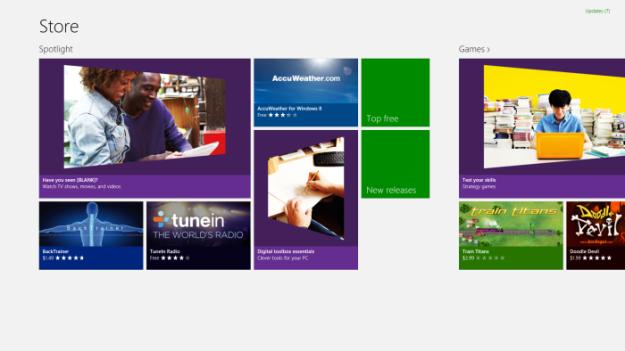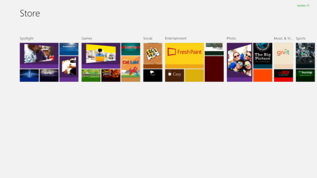 Algunas aplicaciones modernas de Windows 8 también han implementado el Zoom Semántico. En el caso de las aplicaciones la funcionalidad puede varias pero el concepto es el mismo. Se utiliza el Zoom Semántico para poder ver las agrupaciones desde una perspectiva más amplia. Por ejemplo en la aplicación del Windows Store cuando hacemos Zoom Out podemos ver más categorías de las que vemos inicialmente. Otras aplicación utilizan el Zoom Out para mostrar todas las categorías y poder saltar entre ellas.